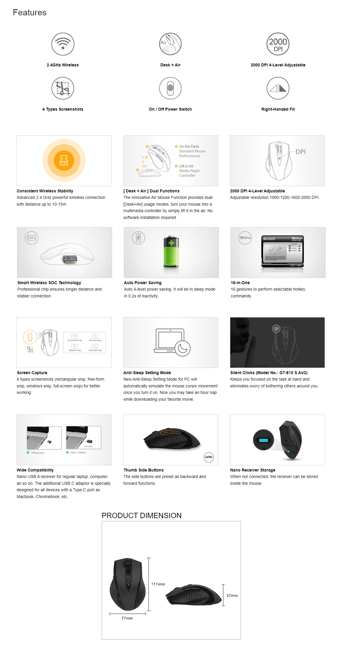 Sensor: Optical Distance: 10~15 m Report Rate: 125 Hz DPI: 1000-1200-1600-2000 Buttons: 7 Style: Right-Handed Fit lncludes: 2.4G Wireless Mouse, Nano Receiver, Type-C Adaptor, 1*AA Battery, User Manual System: Windows 7/8/8.1/10/11