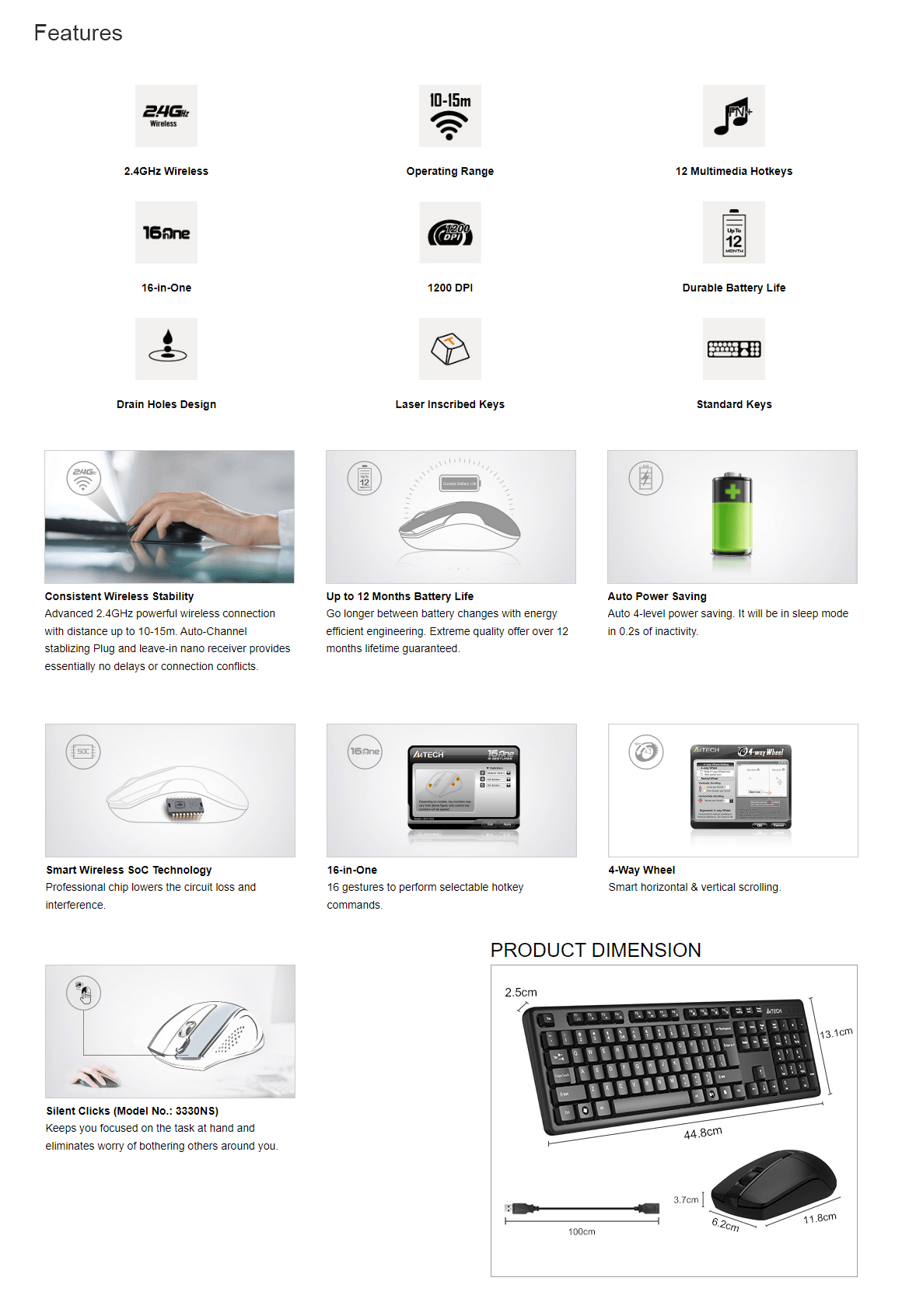 Receiver: RN-20M ( Orange ) Connector: USB Frequency: 2.4G Hz Operating Range: 10 - 15 m Keyboard: GK-3 Keycaps: Traditional Hotkeys: 12 Fn Hotkeys Character: Laser Engraving Adjustable Keyboard Legs: Yes Rating: 3 V / 2 mA Battery: 1AA Alkaline Batteries Mouse: G3-330N Report Rate: 125 Hz Sensor: Optical Resolution: 1200 DPI Rating: 1.5 V / 4 mA Buttons No.: 3 Ergonomic Design: Symmetric Size: Small / Middle / Big Hands Receiver Storage: Yes Battery: 1 AA Alkaline Battery System Requirements:Windows 7 / 8 / 8.1 / 10 Keyboard Weight: 471 g (w/ battery) Mouse Weight: 83 g (w/ battery)