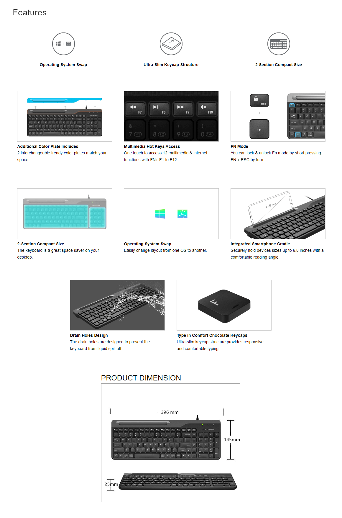 Keyboard: FK25 Keycaps: Ultra-Slim Hotkeys: 12 FN Multimedia Hotkeys Character: Laser Engraving Splash Proof: Yes Rating: 5 V / 100 mA Cable: 150 cm Port: USB Illuminated: No System Platform: Windows|Mac