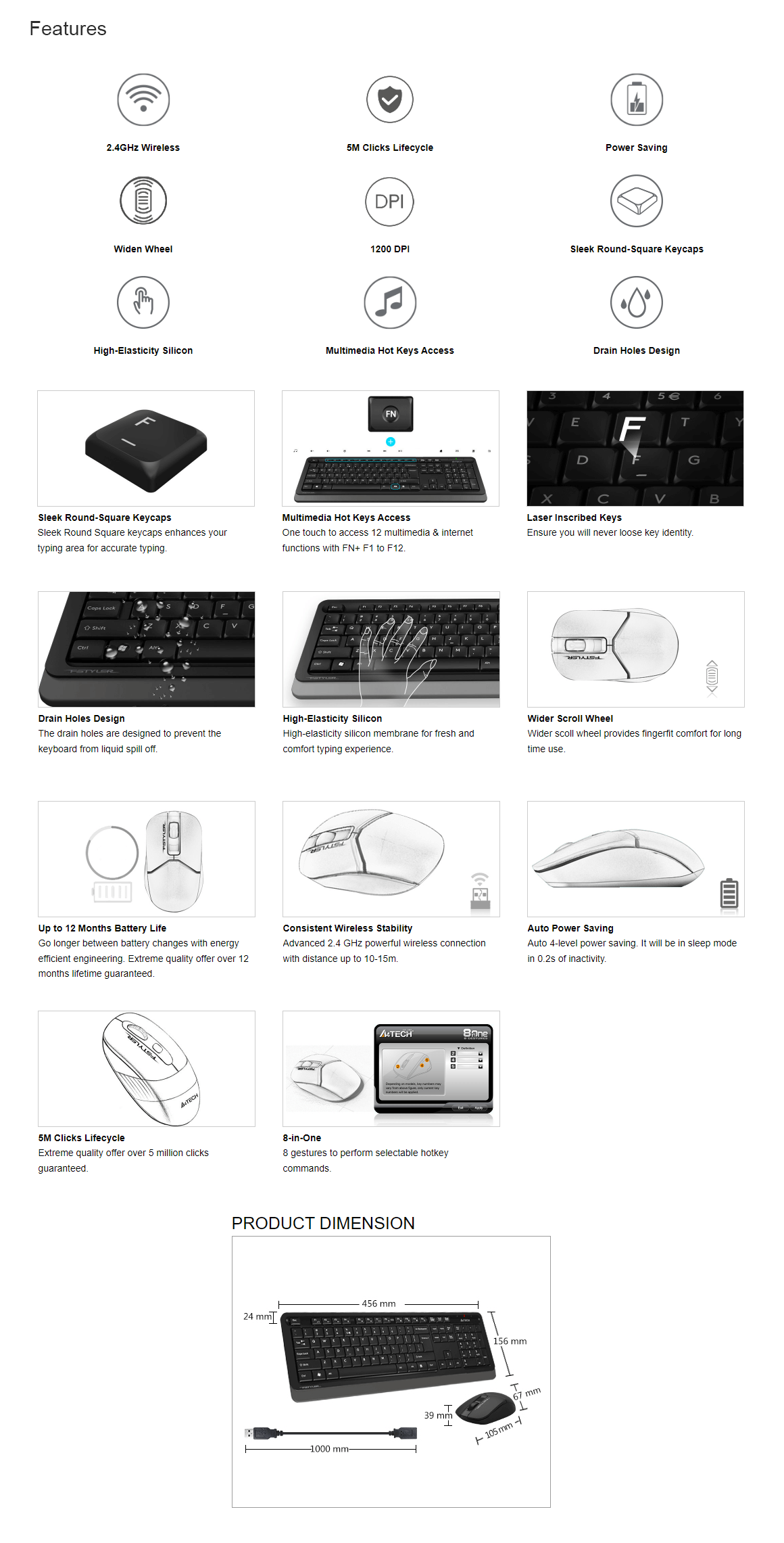 Mouse: FG12 Ergonomic Design: Symmetric Resolution: 1200 DPI Report Rate: 125Hz Buttons No.: 3 Receiver: Nano USB Receiver Keyboard: FGK10 Keycaps: Sleek Round-Square Hotkeys: 12 Fn Hotkeys Character: Laser Engraving Splash Proof: Yes