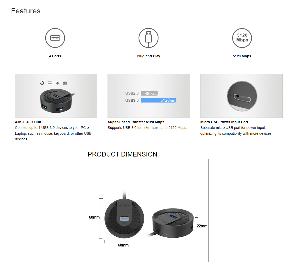 4 Ports USB 3.0 Wide Compatibility Plug and Play Support Charging Super-Speed Transfer Data Transfer: 5120 Mbps Power Input: Micro USB Cable Length: 100 cm Plug: USB Color: Black, White