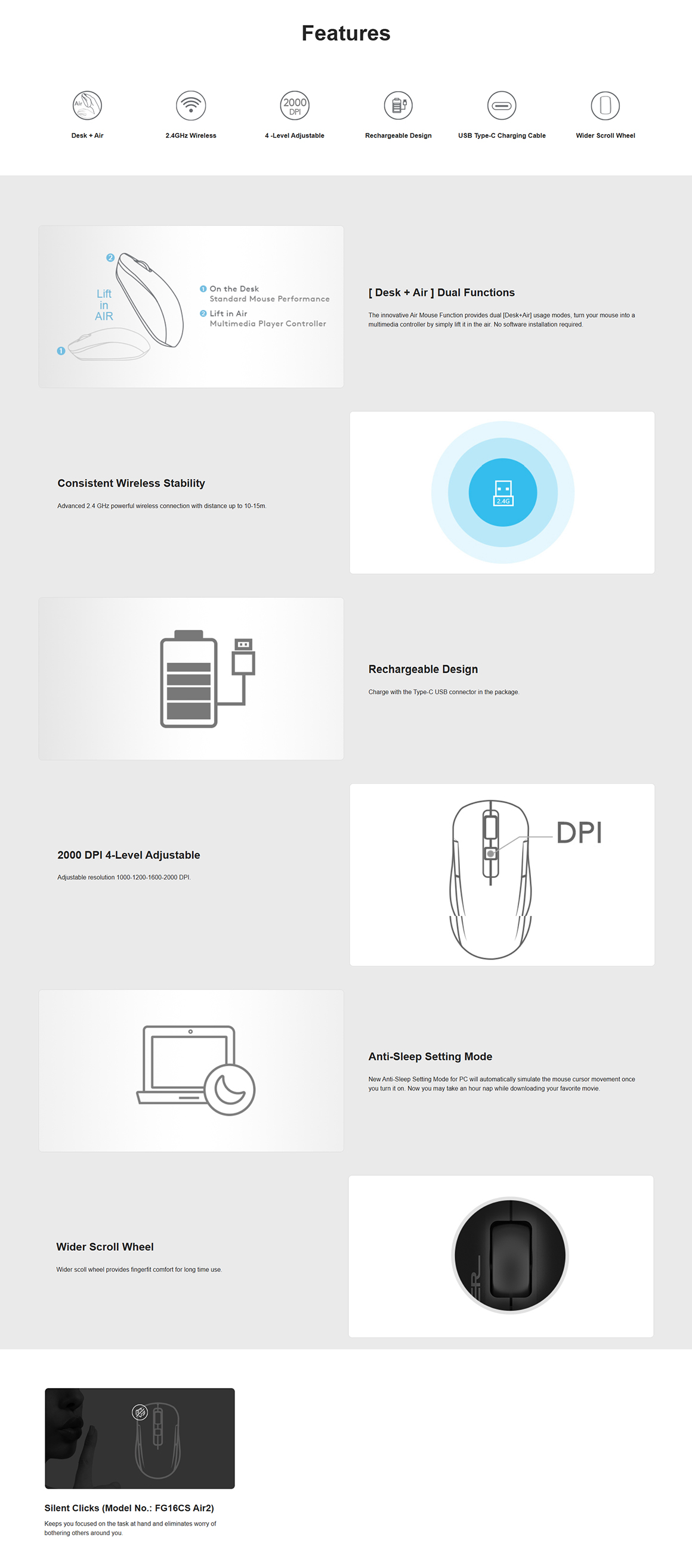 Model: FG16 Sensor: Optical Distance: 10~15 m Report Rate: 125 Hz Buttons: 4 Style: Symmetric Size: 109(L) x 64(W) x 36(H) mm Weight: 73 g System:Windows 10/11