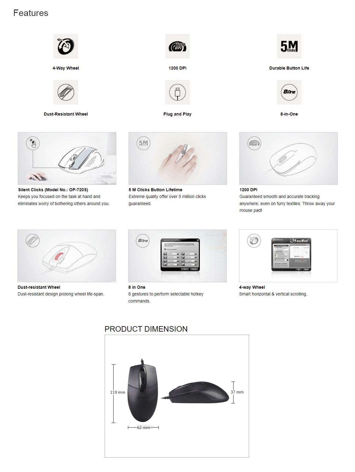 Dust-Resistant Wheel 4-Way Smart Wheel 8-in-One Software Symmetric Design Sensor: Optical Resolution: 1200 DPI Report Rate : 125 Hz Buttons No.: 3 Size: 119 x 62 x 37 mm Weight : 84.7g Color: Black