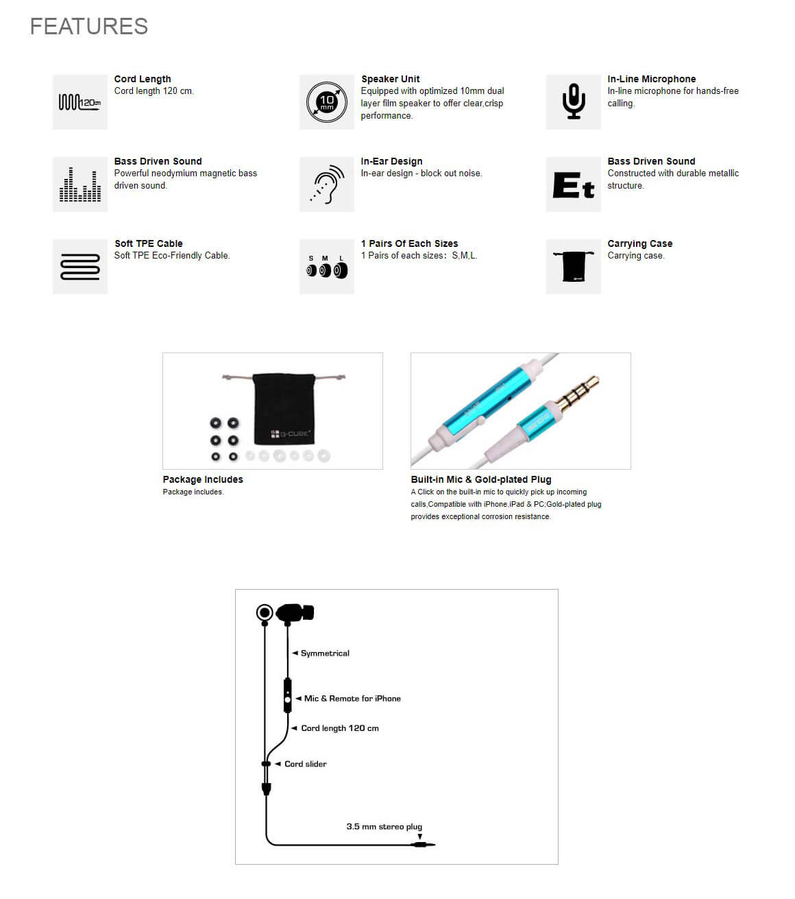 Speaker: 10 mm Sensitivity: 98 dB ± 2 dB at 1 KHz Microphone Sensitivity: -42 ± 3 dB Impedance: 32 Ω Frequency Response: 20 Hz-20 KHz RMS: 3 mW Plug Type: 3.5 mm Cable Length: 120 cm / 47 in. Weight: 16 g Sleeves Size: S, M, L