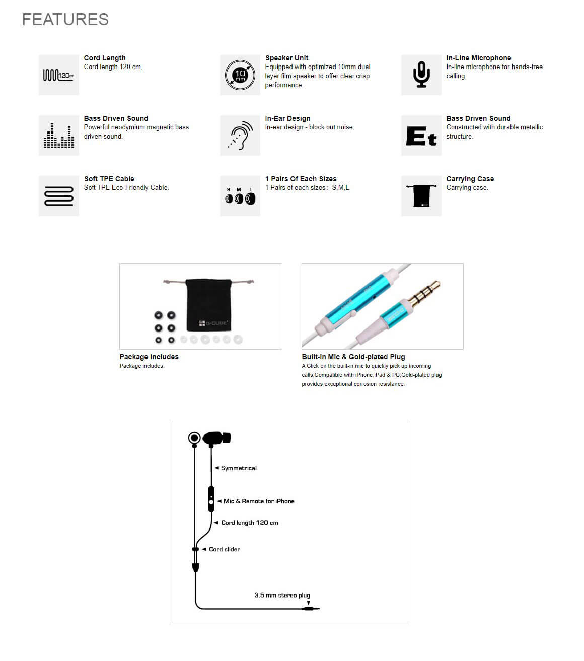 Speaker: 10 mm Sensitivity: 98 dB ± 2 dB at 1 KHz Microphone Sensitivity: -42 ± 3 dB Impedance: 32 Ω Frequency Response: 20 Hz-20 KHz RMS: 3 mW Plug Type: 3.5 mm Cable Length: 120 cm / 47 in. Weight: 16 g Sleeves Size: S, M, L