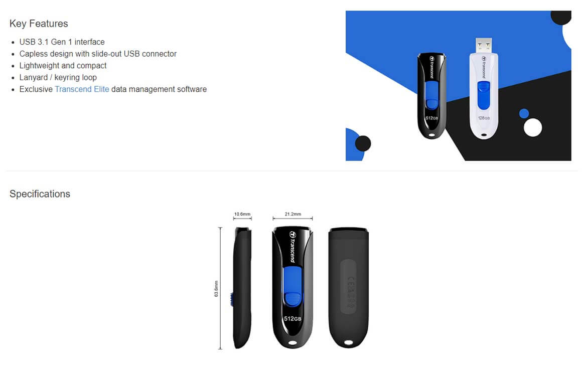 Appearance Dimensions: 63.6 mm x 21.2 mm x 10.6 mm (2.5" x 0.83" x 0.41") Weight: 9 g (0.32 oz) Color: Black/White Interface Connection Interface: USB 3.1 Gen 1 (USB 5Gbps) USB Type: USB Type-A
