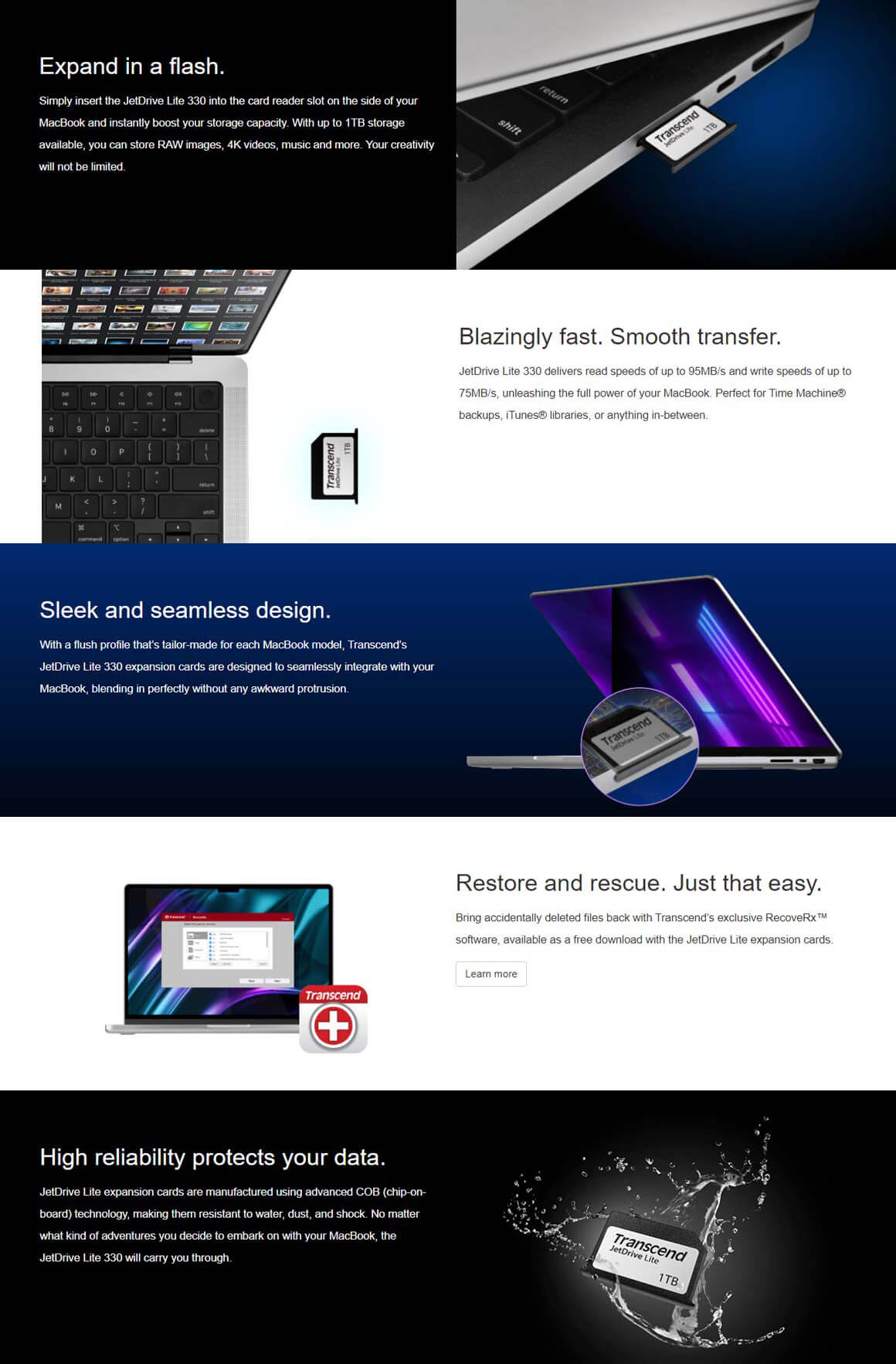 Introducing Transcend’s JetDrive Lite storage expansion cards JetDrive™ Lite 330 for the MacBook Pro 2023 & 2021. JetDrive Lite expansion cards are a quick and easy way to gain the additional space you need without adding any bulk to your MacBook® computer.