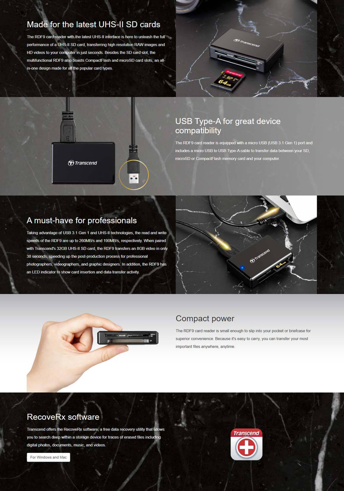 Taking full advantage of the UHS-II technology, the RDF9 UHS-II Card Reader unleashes the high-speed performance of SDXC / SDHC UHS-II memory cards. Equipped with USB 3.1 Gen 1 interface, the RDF9 delivers the blazing fast read and write speeds of up to 260MB/s and 190MB/s accordingly, facilitating high resolution video and RAW image transfers and post-production processing for professional photographers, videographers and graphic designers